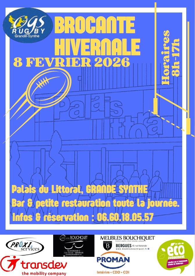 Le Dimanche 8 Février 2026, l'OGS Rugby organise sa brocante annuelle, de 8h à 17h au Palais du Littoral de Grande-Synthe.