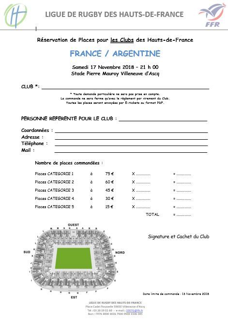 A l'occasion du match France-Argentine, le Samedi 17 Novembre à 21h00, au Stade Pierre Mauroy, la ligue de rugby des Haut de France vous propose de réserver vos place par le biais de l'OGS.